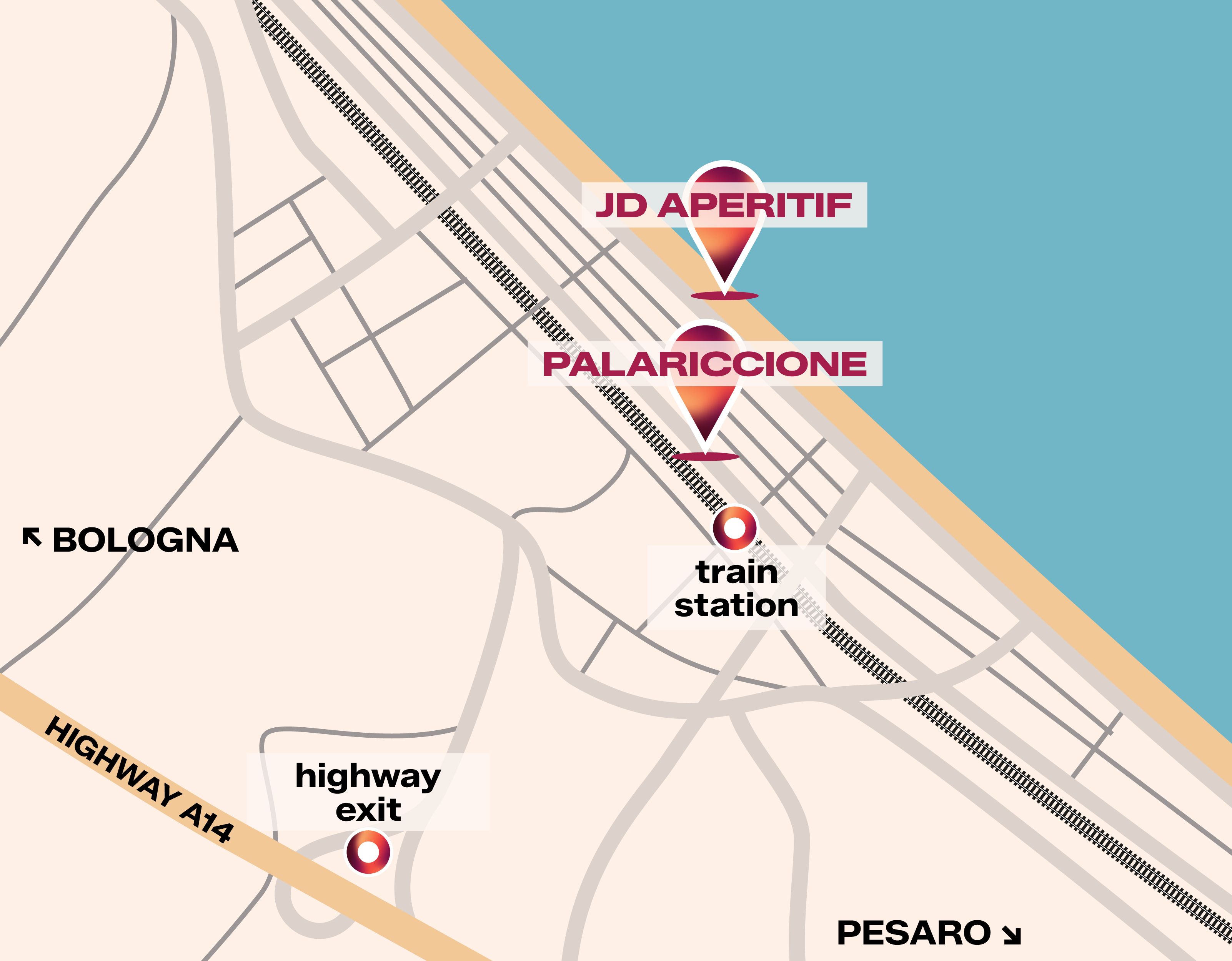 Riccione is easily accessible via the A14 highway (Riccione exit), with direct connections to the main cities of Northern and Central Italy.
